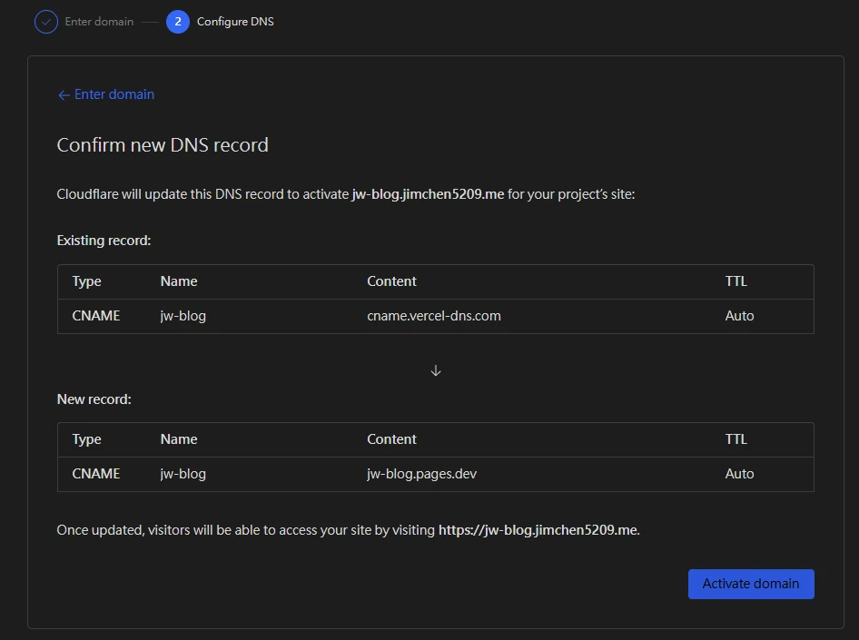 若是使用 Cloudflare 的 DNS 服務,則會自動幫你設定好,例如本例為將網域從 Vercle 轉移到 Cloudflare Page,只需要按Activate domain,若是使用其他的 DNS 服務,請手動設定