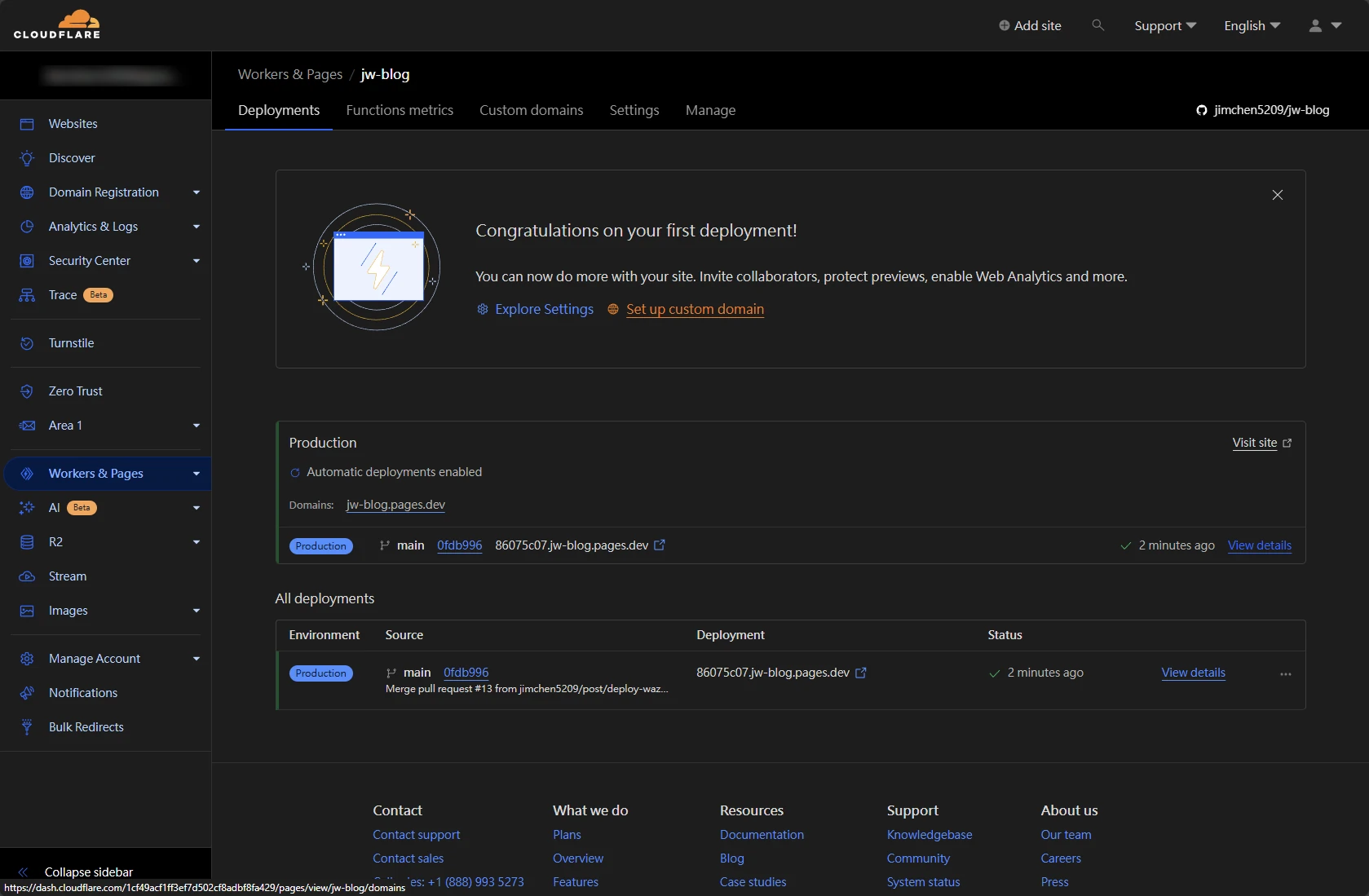 - 建置完成後,即可看到部屬完成的網址,點選即可進入網站
