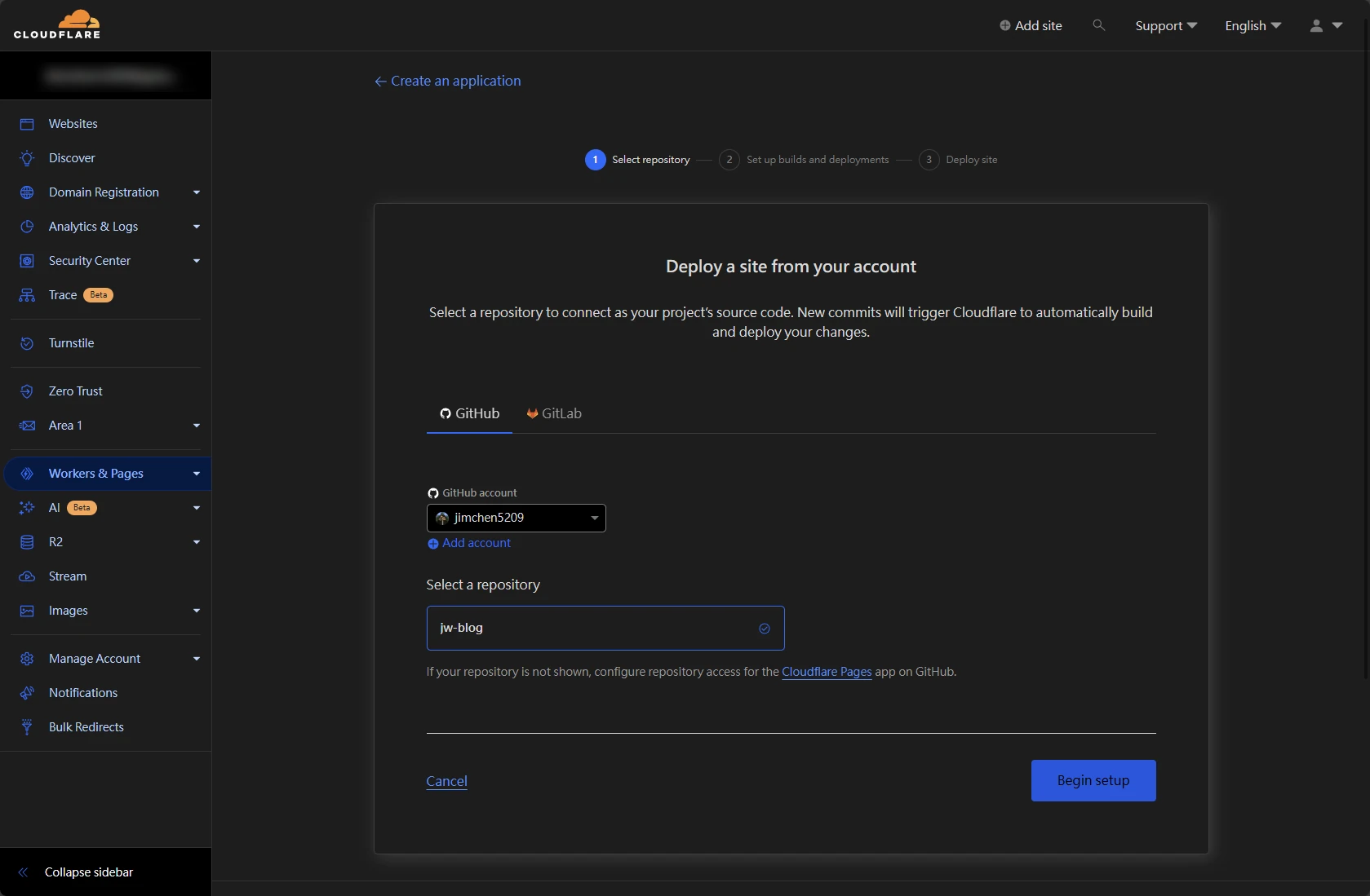 Connect GitHub並授權,然後選擇要部屬的 Repository,然後點選Begin Setup