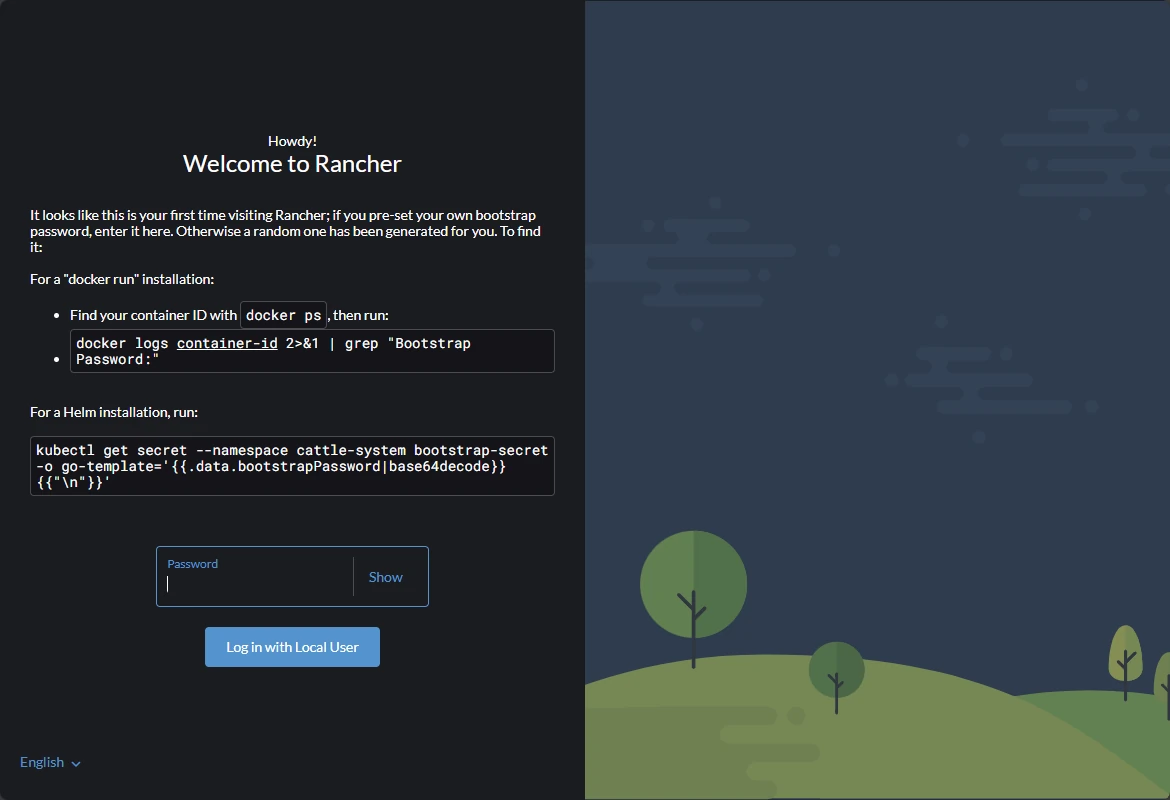 1 | helm install rancher rancher-stable/rancher --namespace cattle-system --set hostname=rancher.k3s-master.lan --set bootstrapPassword=0000 |