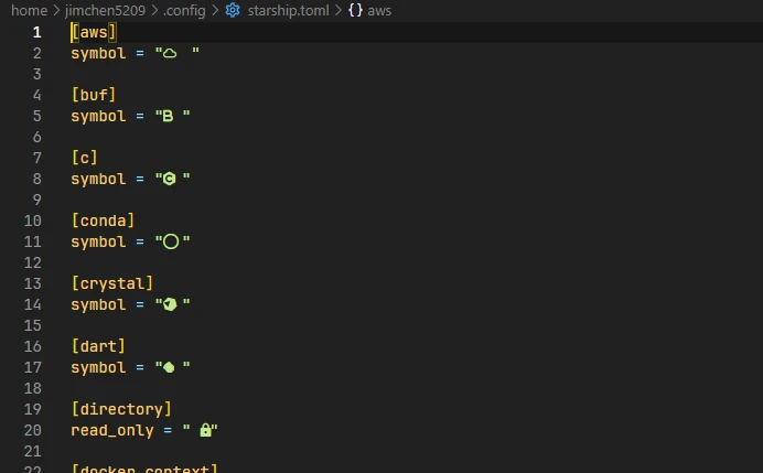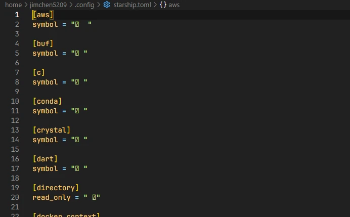 如果還是覺得不滿意的話(就是我),可以開啟設定檔進一步自訂,Starship 的設定檔放在 ~/.config/starship.toml,使用文字編輯器(例如:VSCode)開啟。